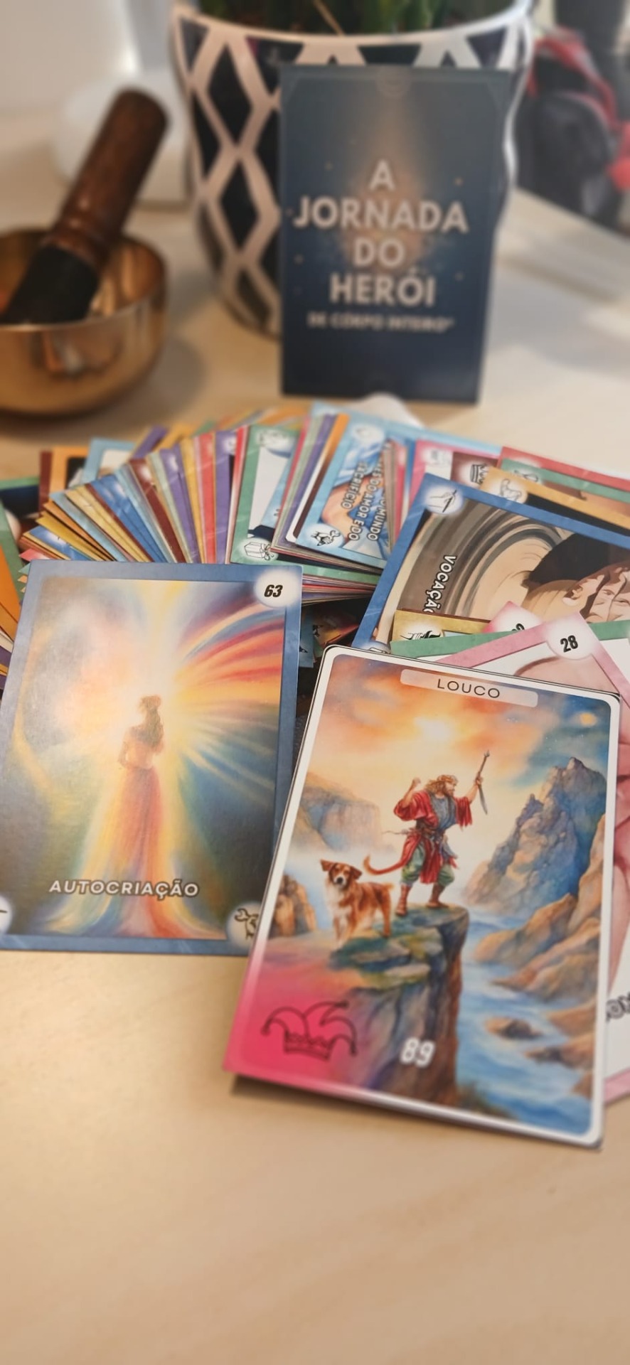 O manual acompanha um baralho de 96 cartas arquetípicas que revelam objetivos, medos, dádivas e tarefas dos 12 arquétipos da Jornada do Herói.